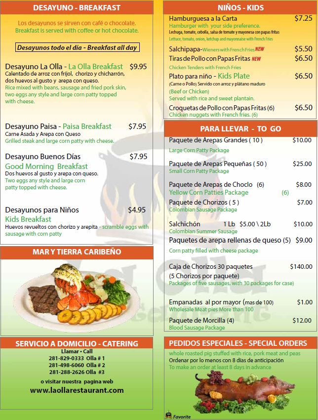Introducing the menu at La Olla, located in Houston, TX, offers a vibrant fusion of authentic Colombian cuisine that beckons the senses. This gem is famous for its diverse selection of Jugos Naturales, featuring refreshing natural fruit juices like guanabana, mango, and passion fruit, each priced at just US$4.50. For a hearty meal, their chicken dishes shine, with options such as Pechuga En Champinones and Arroz Con Pollo, each thoughtfully prepared to satisfy any palate.